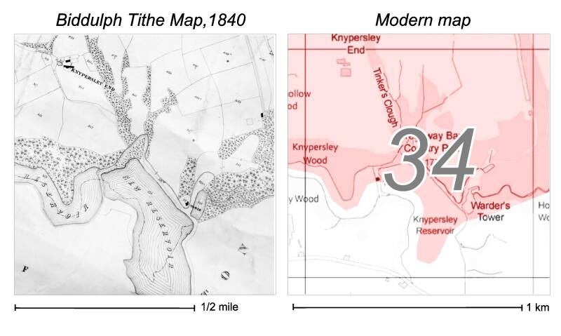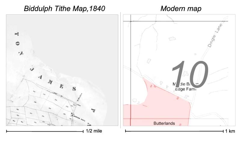 The plot numbers of the 1840 Map in the close-up sections below are compared with the modern areas of Biddulph explanations of each field can be seen in the schedules 1-71