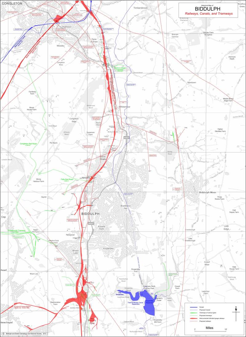 The Trent & Mersey Canal Company surveyed a route through the Biddulph Valley in 1811, with a long tunnel at Knypersley, to counter other opposing canal schemes. It did not proceed and neither did a branch from the Macclesfield Canal to Whitemoor with connecting railways proposed in 1838. Although there were some earlier colliery tramways, Biddulph did not get a public main line until the North Staffordshire Railway opened their route in 1860.